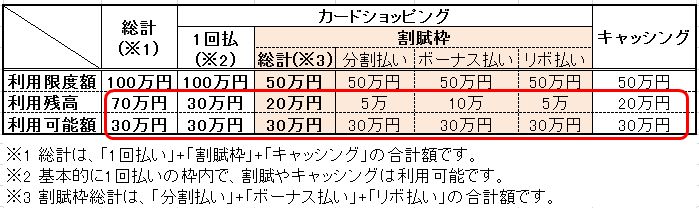 上記表をご覧いただければ分かるかと思いますが、1回払いの限度額が100万円で、利用残高が30万円であるにも関わらず、利用可能額(カード決済できる金額)は30万円です。